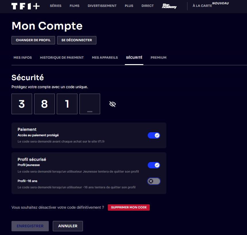 Si vous possédez un compte sur lequel figurent votre profil, celui de vos enfants de -10 ans (profil jeunesse) et/ou un profil -16 ans, pour vos ados, vous avez la possibilité de créer un "code de sécurité".